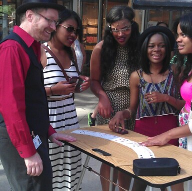 At small gatherings, I typically perform at a table. At larger events, I walk around performing “strolling magic,” tactfully creating and entertaining ever-changing audiences, either standing with guests or approaching their tables. Laughter or applause or “What?! How did that happen?” attracts new people to watch or get involved; often, word of mouth continues the momentum. I enjoy inviting people to partake in the amusement. I respect participants so they have a great time.